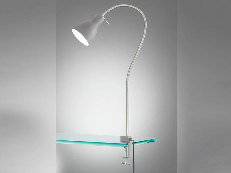 Die Oberfläche der Klemmlampe LOLLAND besteht aus Metall in Sandgrau, der Flexschlauch ist in Nickel matt gehalten. Die Leuchte hat eine Ausladung von 65 cm, ist – je nach Einstellung des Flexschlauchs – zwischen 50 cm bis 100 cm hoch und lässt sich an allen Möbelstücken oder Regalbrettern mit einer Klemmbreite von 1 cm bis max. 6,5 cm befestigen.