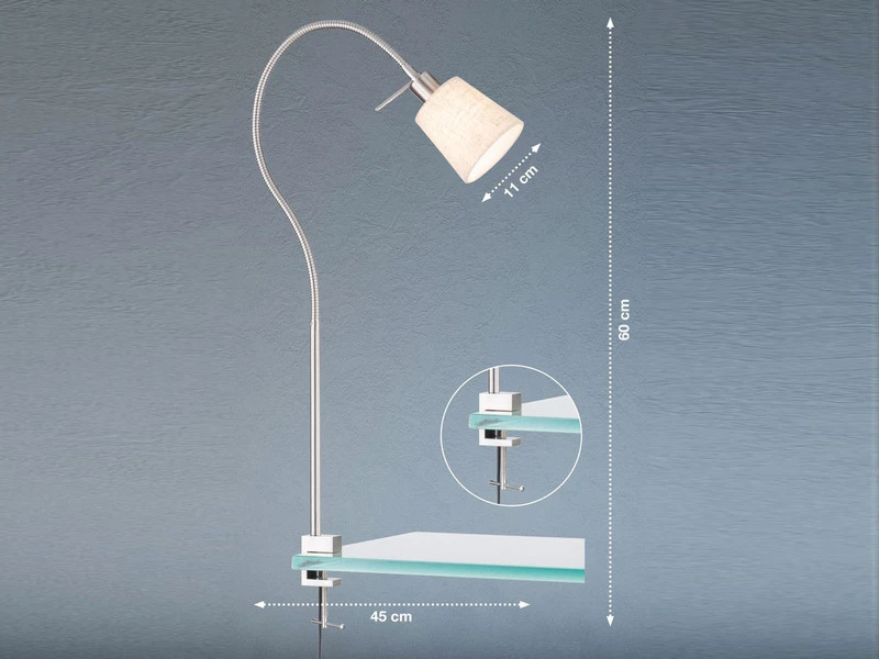 Die moderne Schwanenhalslampe setzt sich aus einem flexibel ausrichtbaren, beigefarbenen Leinen Lampenschirm mit einem unteren Durchmesser von 11 cm und einem silber matten Leuchtenkorpus zusammen. Die Ausladung der Leuchte beträgt 45 cm, die Höhe 60 cm. Sie lässt sich an allen Möbelstücken oder Regalbrettern mit einer Klemmbreite von 1 cm bis max. 2,7 cm befestigen und ist mit einem Kabel und einem Stecker ausgestattet, so dass sie über jede Steckdose angeschlossen werden kann. Mittels Schnurschalter für Ein-/Aus können Sie die Klemmleuchte bequem bedienen.