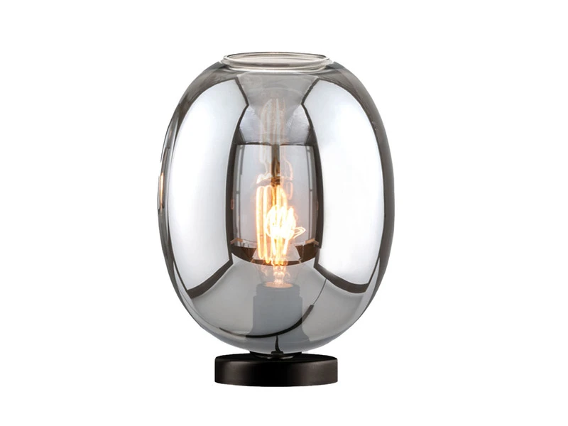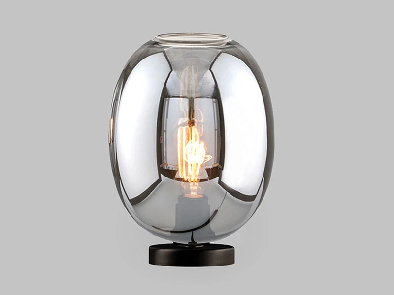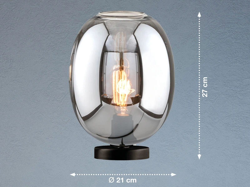 Die 27 cm hohe Designtischleuchte setzt sich aus einem puristischen Leuchtenfuß aus schwarzem Metall und einem ovalen Rauchglasschirm mit einem Durchmesser von 21 cm zusammen. Der Retro Look wird durch den angesagten Farb- und Materialmix perfekt abgerundet und sorgt für ein tolles Erscheinungsbild. Durch die Metall- und Glasdetails ist die Leuchte in jedem Fall sehr dekorativ und lässt sich in viele Einrichtungsstile perfekt integrieren.