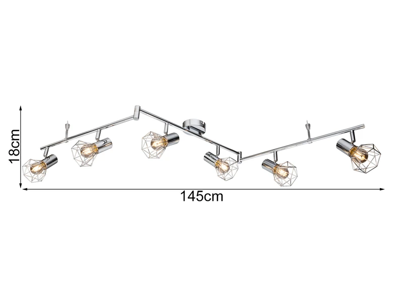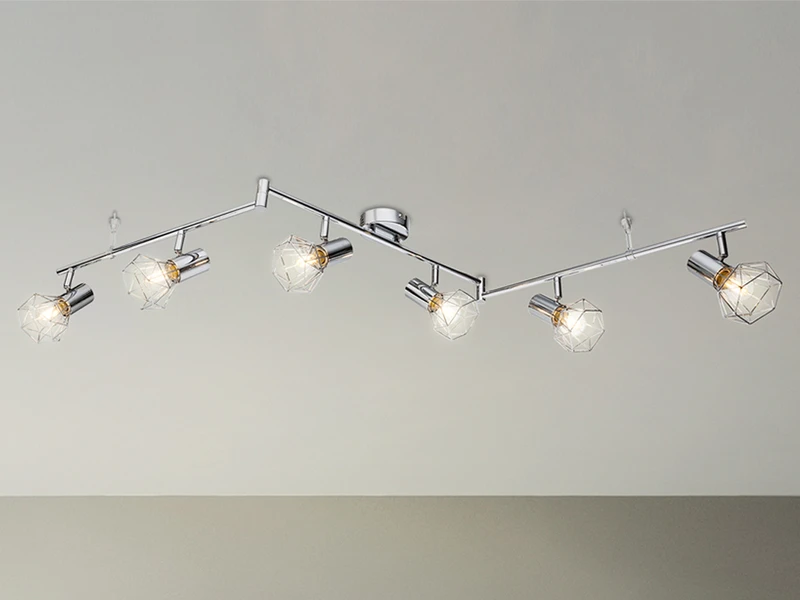 Das besondere Erscheinungsbild des Deckenstrahlers entsteht durch den sechs verchromten Gitterlampenschirmen die den Blick auf die Leuchtmittel freigeben.