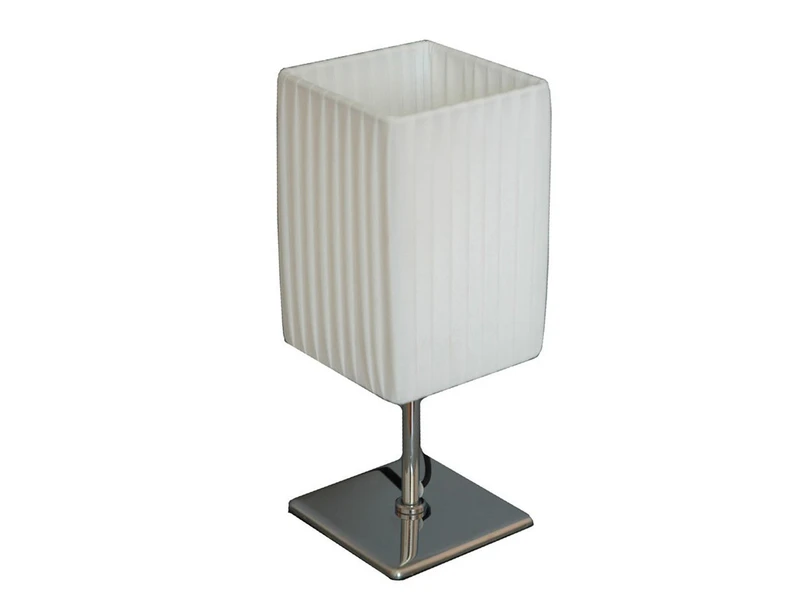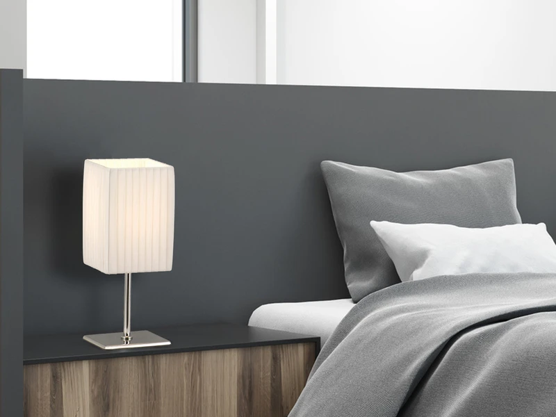 Das ausgefallene „Faltendesign“ des weißen Stoffschirms verleiht der Tischleuchte ihren unverwechselbaren Charakter und sorgt im Zusammenspiel mit dem Chrom glänzenden Leuchtenfuß für schöne Lichtmomente.