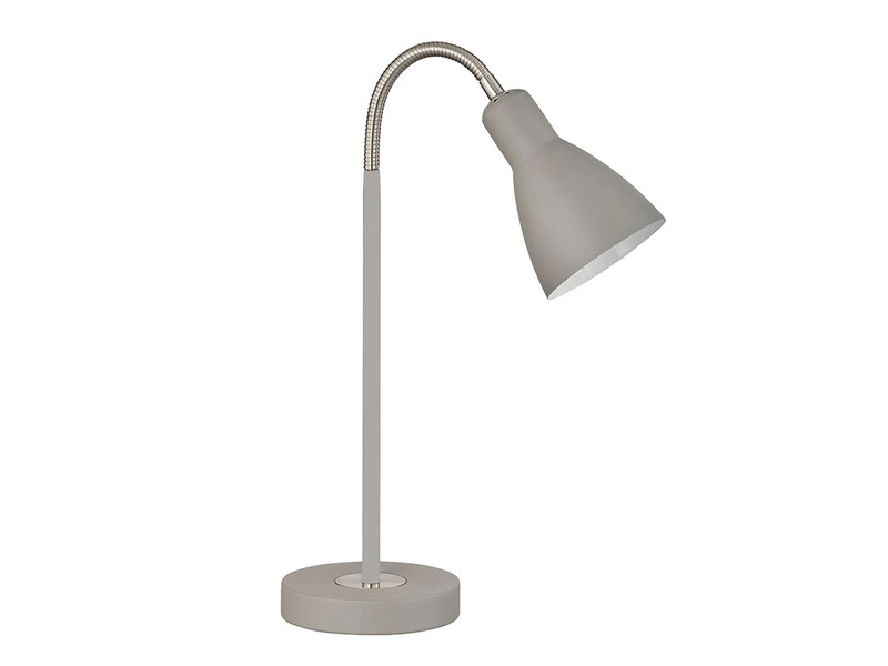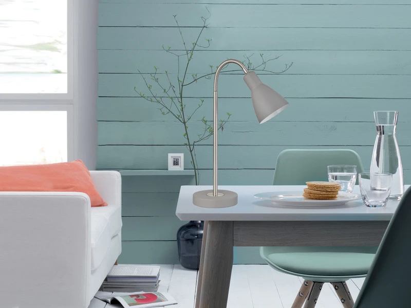 Die Oberfläche der Tischlampe besteht aus Metall in Sandgrau und Nickel matt. Der Lampenschirm des Reflektors hat einen Durchmesser von 14 cm und lässt sich flexibel nach Ihren Wünschen einstellen. Die Gesamthöhe der Leuchte beträgt 43 cm, der Schnurschalter für Ein/Aus sorgt für eine komfortable Bedienung. So haben Sie jederzeit eine auf Ihre Wünsche abgestimmte Beleuchtung.