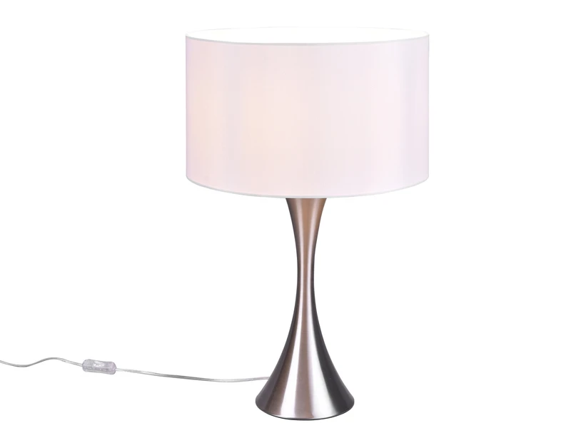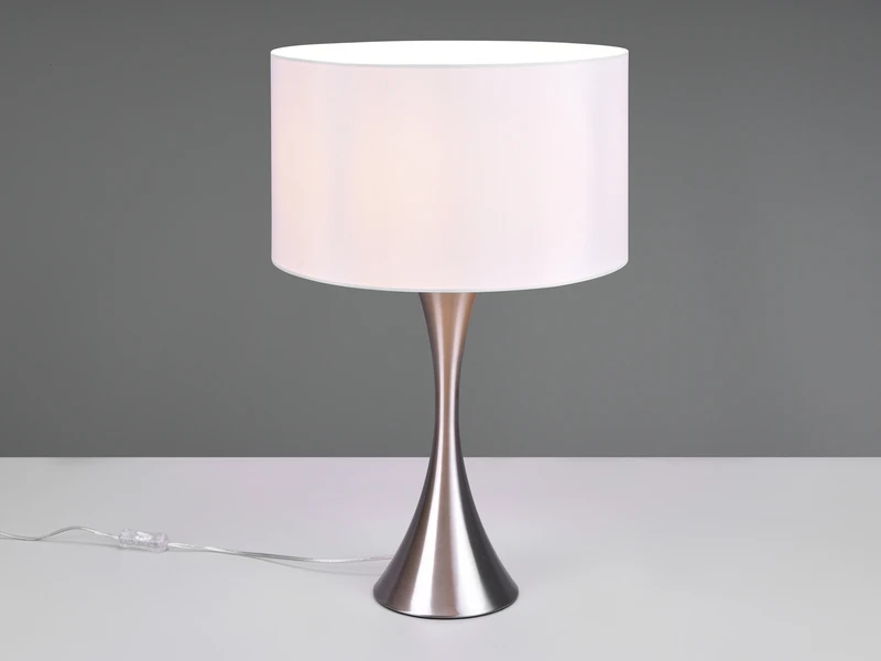 Der edle Stoffschirm der Tischleuchte in Kombination mit dem elegant geschwungenen Leuchtenfuß aus Metall vermitteln ein harmonisches Gesamtbild. Das schlichte und edle Design in Silber matt mit weißem Schirm setzt dekorative Akzente in Ihrem Zuhause. Mit einer Höhe von 62 cm sowie einem Schirm-Durchmesser von 40 cm passt sich die Lampe ihrer Umgebung dezent an und sorgt für ein gemütliches Licht.