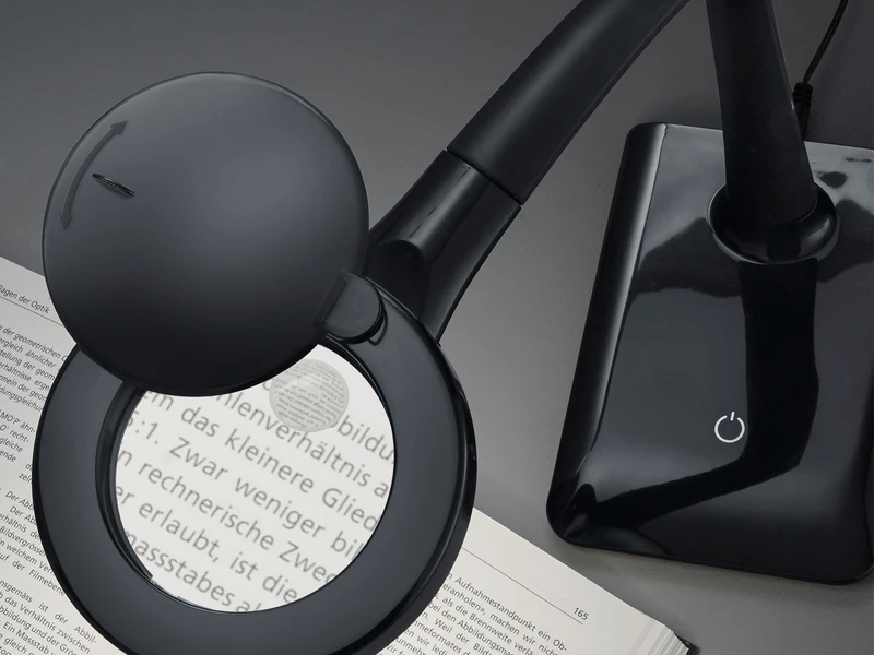 Als besonderes Highlight ist in jedem 13,5 cm großen Leuchtenkopf eine Leselupe mit 3-fach Vergrößerung eingebaut. Mit dieser Lupe lassen sich auch kleine und filigrane Arbeiten am Schreibtisch bestens erledigen.
