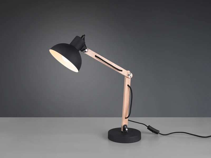 In Ihrem Wohnbereich, Büro oder auch in Ihrem Kinderzimmer kommt diese besonders gut zur Geltung. Sie wird über einen Schnurschalter bedient und hat eine max. Höhe von 50cm. Die Kombination aus schwarzem Metall und Naturholz macht die Leuchte zu einem echten Hingucker.