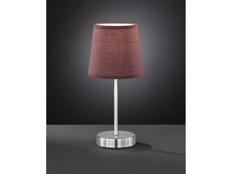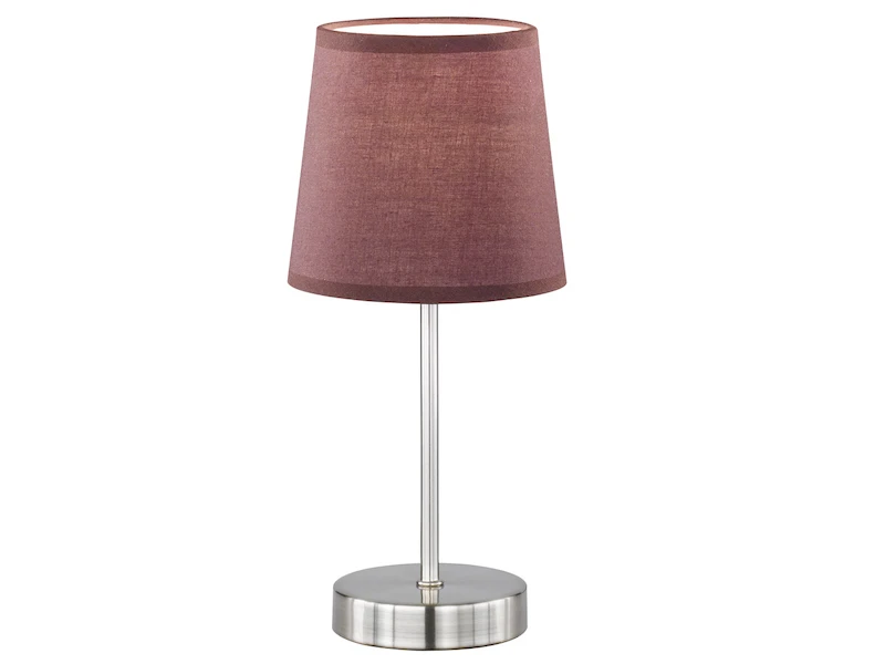 Der runde Stofflampenschirm mit einem Durchmesser von 14cm ist in der Farbe Hellbraun gefertigt und unterstützt zusätzlich die Lichtwirkung. Der Korpus aus Metall in mattem Nickel verleiht der insgesamt 32cm hohen Tischlampe einen eleganten Charakter. Über den Schnurzwischenschalter können Sie die Leuchte bequem ein- und ausschalten.