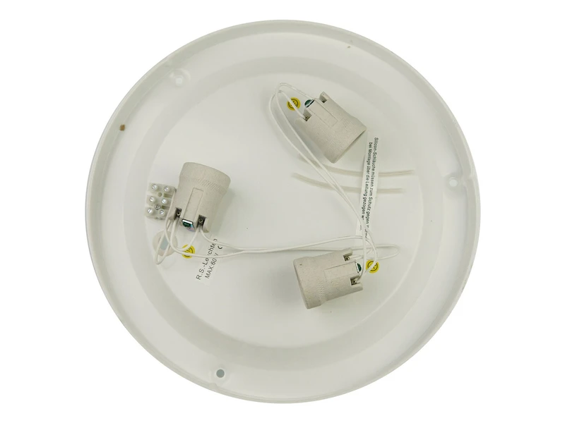 Die Deckenbefestigung der Flurlampe besteht aus weißem Metall, das Leuchtenglas wird durch einen Bajonett-Verschluss befestigt und ermöglicht daher eine werkzeuglose Montage.