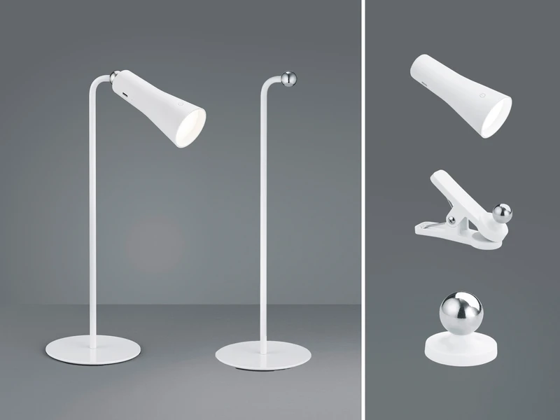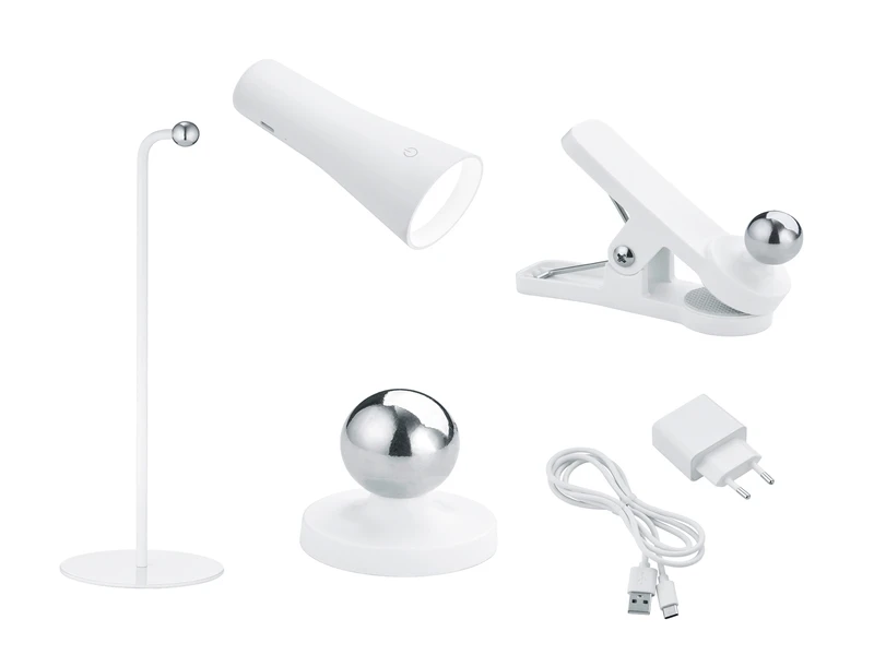 Die Tischleuchte hat eine Höhe von 36cm und ist über die Touchfunktion in 3 Stufen dimmbar. Perfekt für den Einsatz auf dem Schreibtisch, dem Nachttisch oder als mobile Leselampe. Mit der mitgelieferten Klemmvorrichtung können Sie die Leuchte auch ganz praktisch als Klemmleuchte nutzen. Dazu ist der magnetische Leuchtenkopf einfach abnehmbar und lässt sich an der Klemmvorrichtung ansetzten.