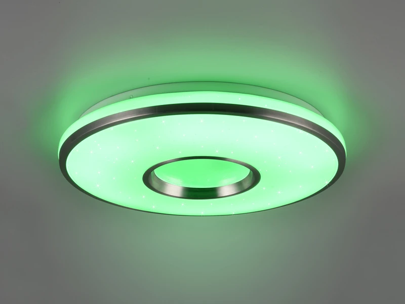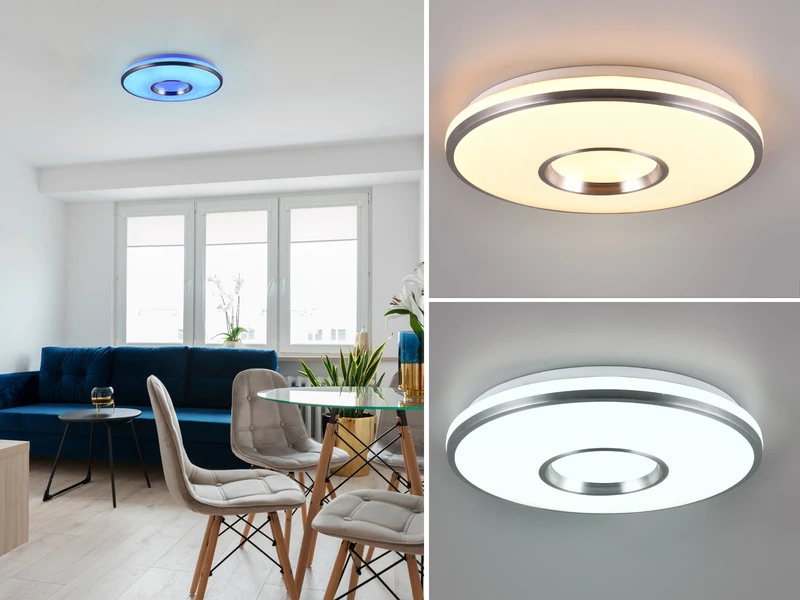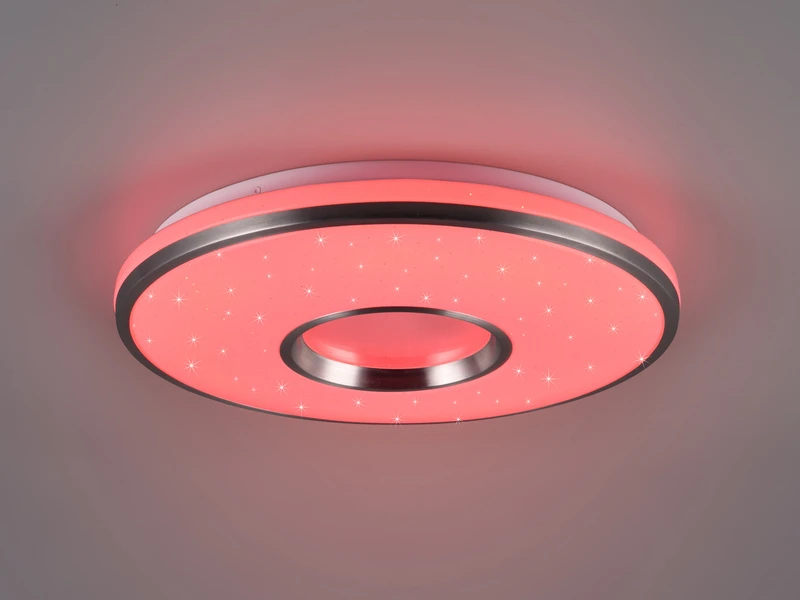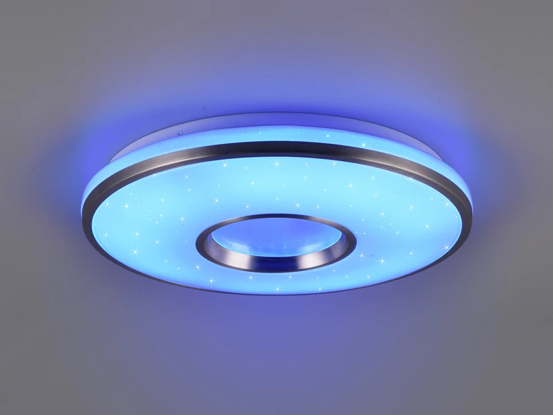 Mit der beigefügten Fernbedienung können die Lichtfarbe von 2700-6500 Kelvin, sowie Helligkeit bequem aus der Ferne gesteuert werden. Der glanzvolle Sterneneffekt des Starlight Covers fasziniert Jung und Alt und verleiht der der Deckenlampe eine besondere Note.