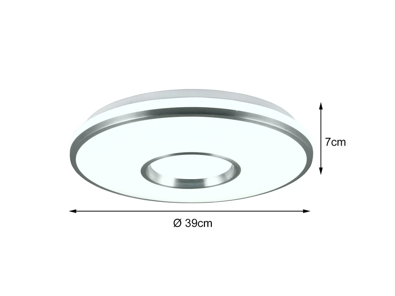 Die Leuchte hat einen Durchmesser von 39cm, ist mit einer Höhe von 7cm extrem flach, und somit zur Wand- und Deckenmontage geeignet.