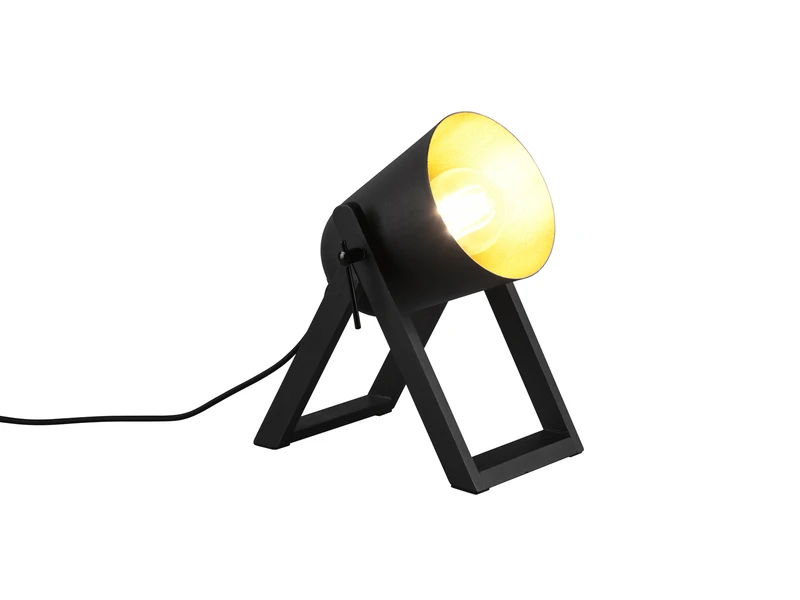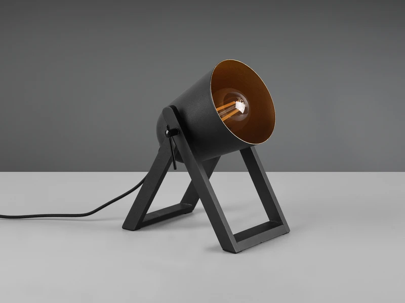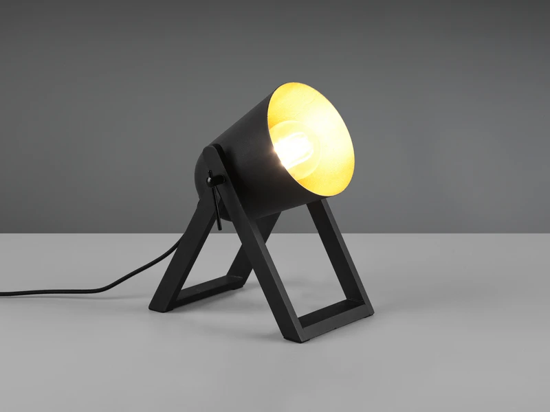 Die Leuchte lässt sich in zwei Richtungen verstellen, sodass der Lichtfall jederzeit passend ausgerichtet werden kann. Die coole Tischleuchte wird über den Schnurschalter bedient und hat eine Höhe von 21 cm. Die Leuchte ist aus schwarzem Naturholz mit einem Lampenschirm aus Metall in Schwarz-Gold kombiniert, kann somit sehr schön als Design Akzent überall in der Wohnung eingesetzt werden.