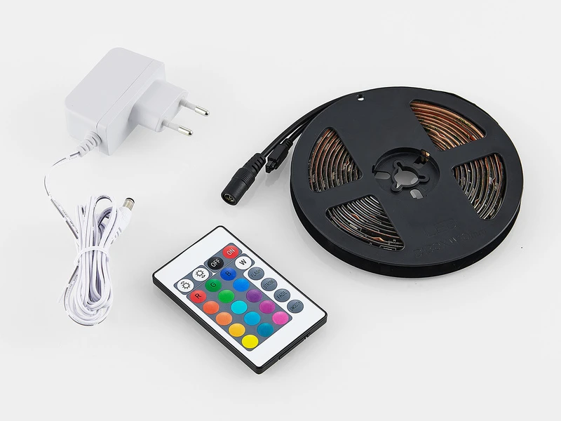 Die auf dem drei Meter langen Streifen verbauten LED lassen sich mit Hilfe der beigelieferten Fernbedienung in allen Regenbogenfarben schalten. Zusätzlich ist die Leuchte mit einem stufenlosen Dimmer ausgestattet und verfügt über eine Memory Funktion, womit die zuletzt gewählte Licht-Einstellung gespeichert wird, und beim erneuten Einschalten der Leuchte wieder erstrahlt.