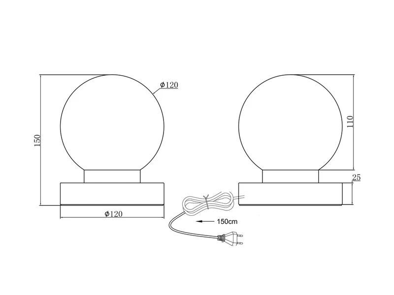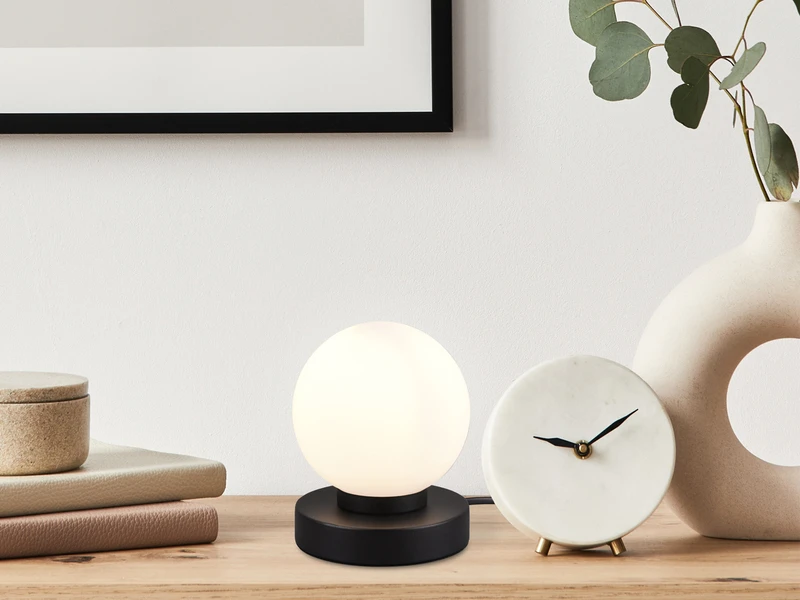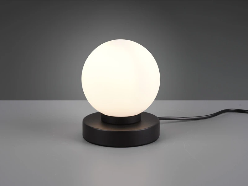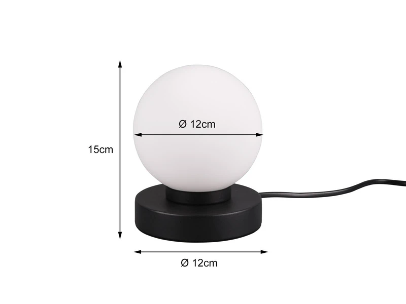 Der runde kugelförmige Schirm hat einen Durchmesser von 12cm und ist aus Glas in Weiß matt gefertigt. Der Sockel aus Metall in Schwarz matt verleiht der insgesamt 15cm hohen Tischlampe einen eleganten Charakter.