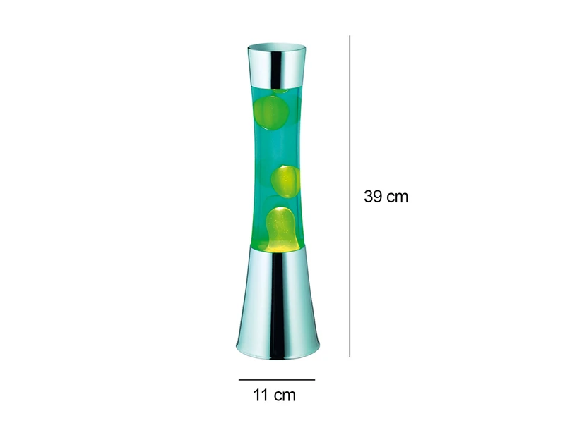 Die Säule ist nach der Kinderleuchtenverordnung DIN EN 60598-2-10 geprüft und hat eine Höhe von 39cm sowie einen Durchmesser von 11cm. Der Fuß der LAVA Tischleuchte ist in Chrom gehalten, während das Wachs mit gelb-goldener Farbe einen schönen Kontrast zu der blauen Flüssigkeit bietet.