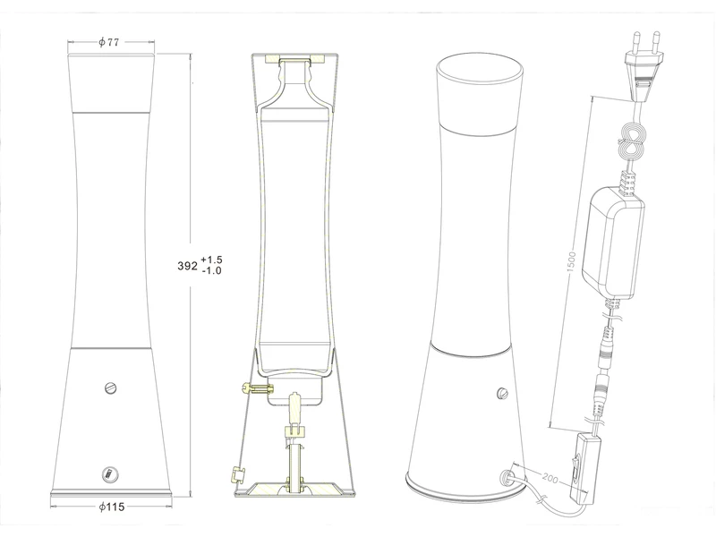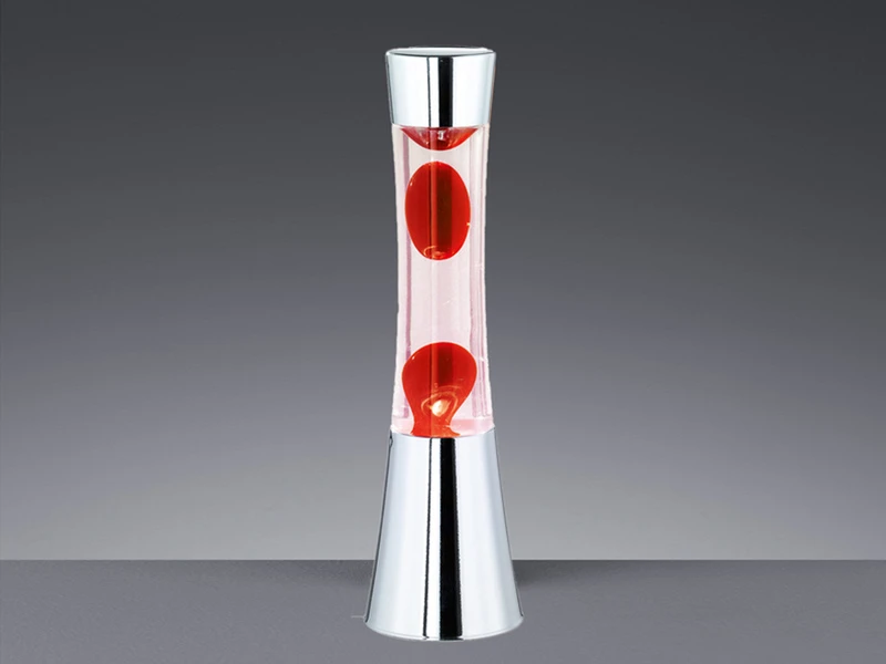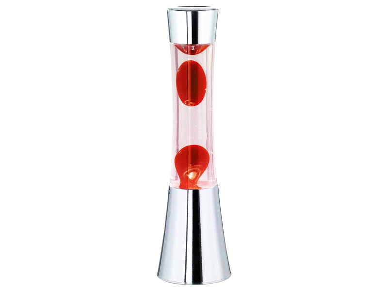 Die Säule ist nach der Kinderleuchtenverordnung DIN EN 60598-2-10 geprüft und hat eine Höhe von 39cm sowie einen Durchmesser von 11cm. Der Fuß der LAVA Tischleuchte ist in Chrom gehalten, während das Wachs mit roter Farbe einen schönen Kontrast zu der klaren Flüssigkeit bietet.