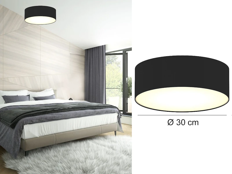 Das zeitlose Erscheinungsbild der Deckenleuchte sorgt im Zusammenspiel mit der unteren, weißen Kunststoffabdeckung für ein faszinierendes Licht Ambiente. Der schwarze Stoffschirm hat einen Durchmesser von 30 cm sowie eine Höhe von 11 cm.