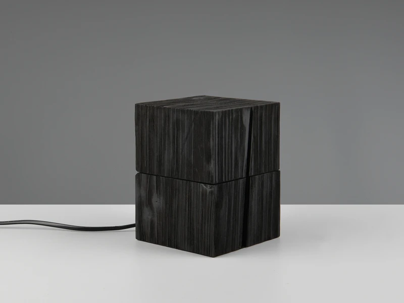 Komplett aus Holz in der Farbgebung Schwarz gefertigt und in cooler Würfeloptik ist die Tischlampe ein tolles Beleuchtungsaccessoire für nahezu jedes Interieur.
