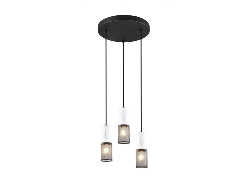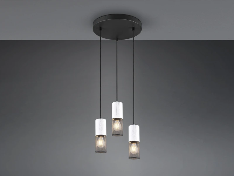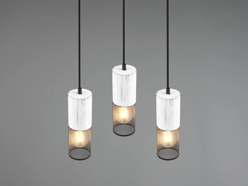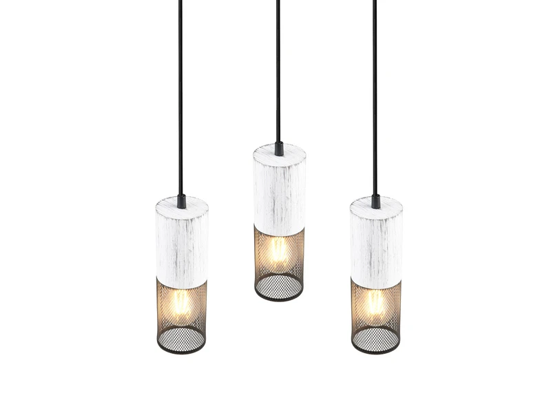 Die Lampenschirme der Ø 28cm Hängeleuchte bestehen aus schwarzem Drahtgeflecht und Holz in Weiß antik, dass der Leuchte ihren Vintage Look verleiht.