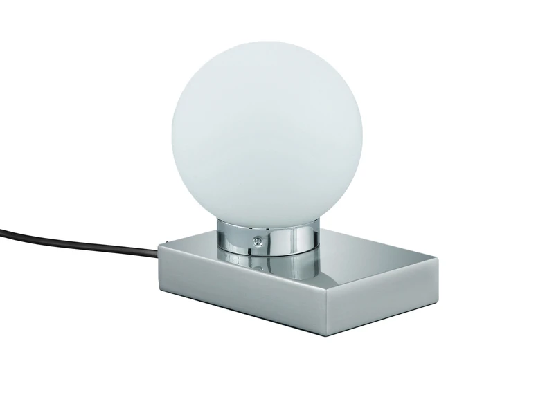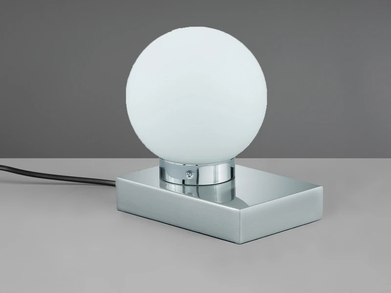 Der runde kugelförmige Schirm hat einen Durchmesser von 12 cm und ist aus Glas in weiß matt gefertigt. Der Sockel aus Metall in Silber matt verleiht der insgesamt 15 cm hohen Tischlampe einen eleganten Charakter.